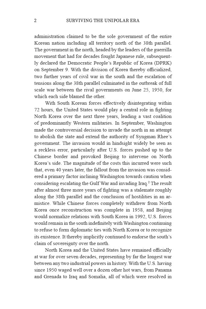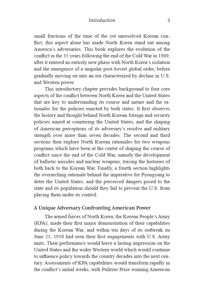 North Korea and the United States have remained officially at war for over seven decades, representing by far the longest war between any two industrial nations in history. With the U.S. having since 1950 waged well over a dozen other hot wars, from Panama and Grenada to Iraq and Somalia, all of which were resolved in small fractions of the time of the yet unresolved Korean conflict, this aspect alone has made North Korea stand out among America’s adversaries. This book explores the conflict’s evolution in the 35 years following the end of the Cold War in 1989, after it entered an entirely new phase with North Korea’s isolation and the emergence of a unipolar post-Soviet global order, before shifting into a new era as the unipolarity that characterized post-Cold War geopolitics gradually diminished.
