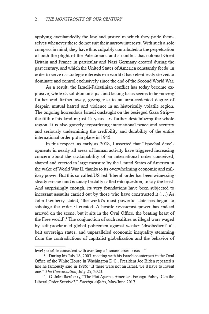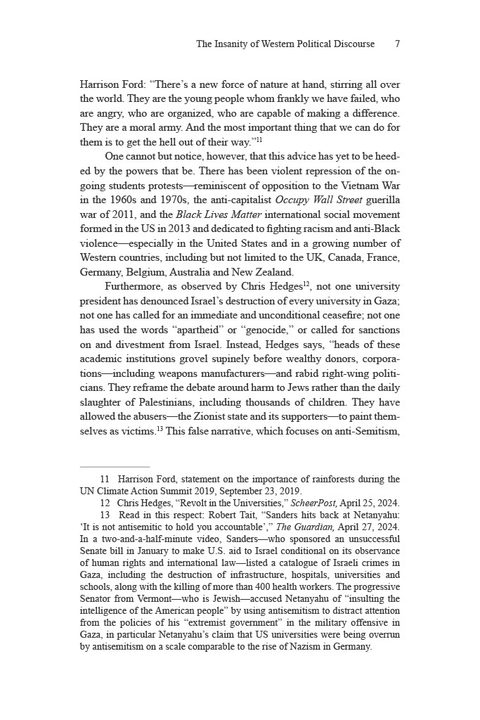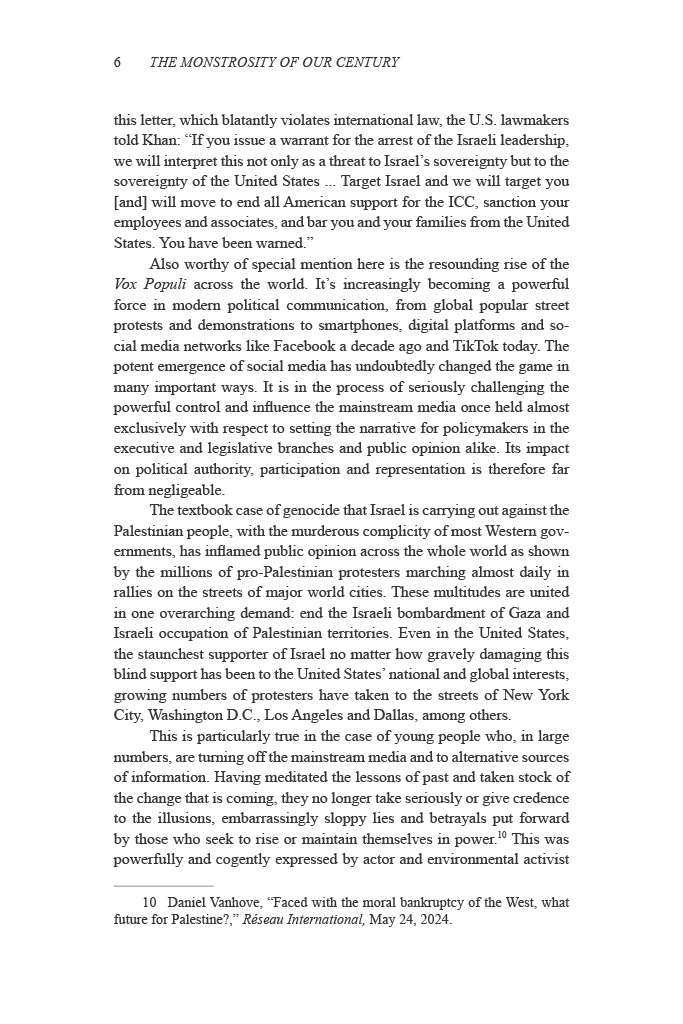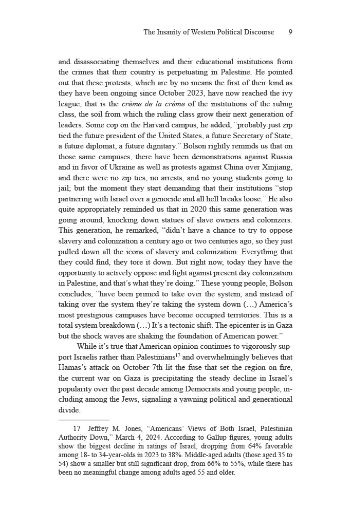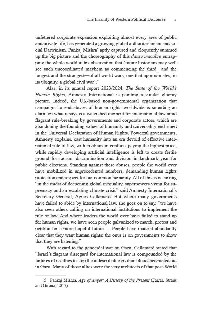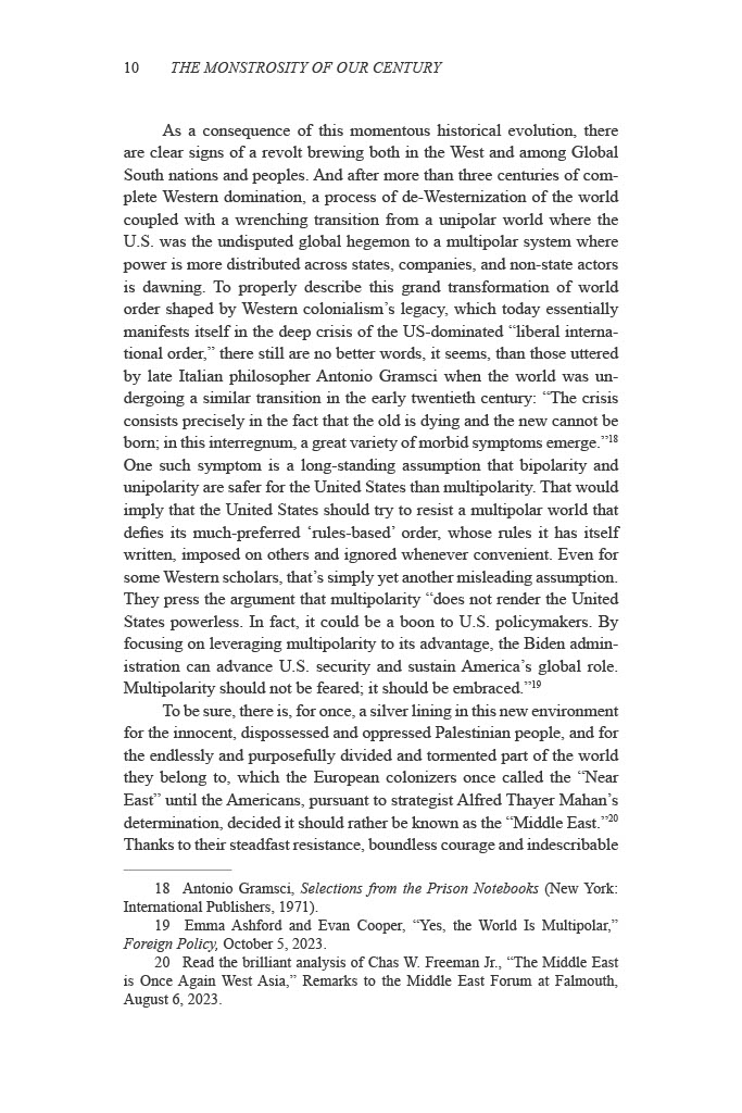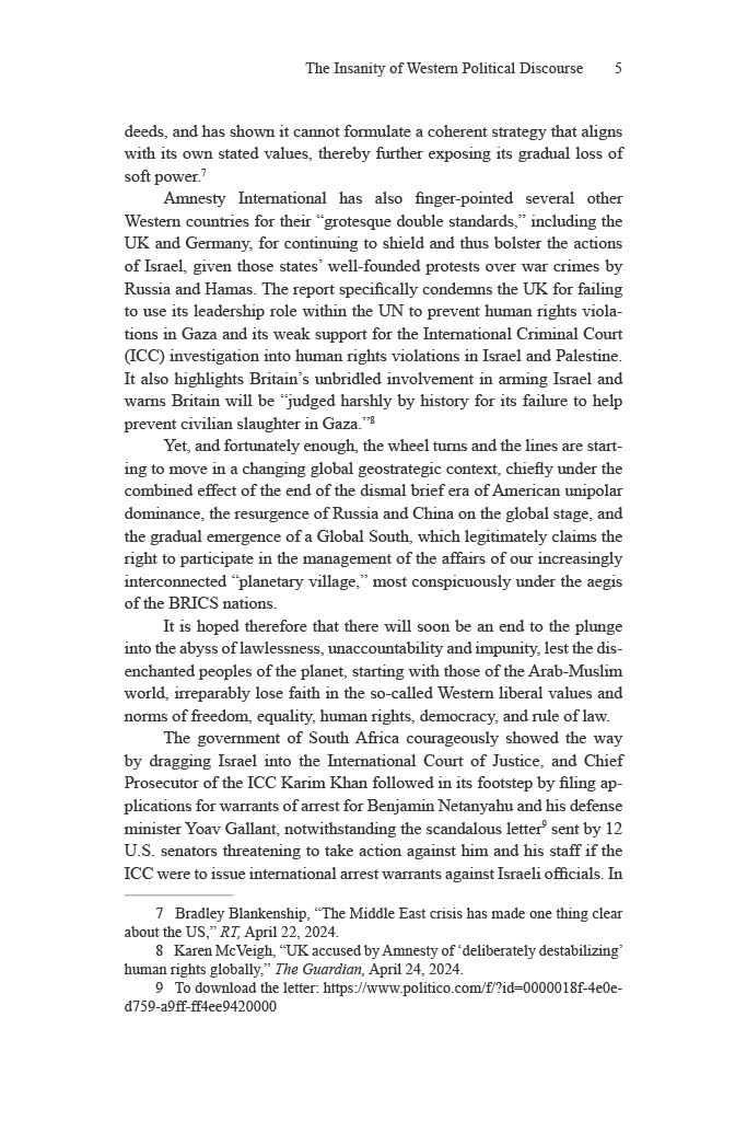 Nour foresees that a process of de-Westernization is dawning. While the West’s triumphal unipolar moment at the fall of the Soviet Union led to Francis Fukuyama’s claims of The End of History and the Last Man and the global establishment of liberal democracy, in actuality the wrenching transition from a hegemonic world order now underway is progressively leading not just to the abandonment of democratic values by those countries who pursued its ascendancy, but a global repugnance at their flagrant complicity in genocide.