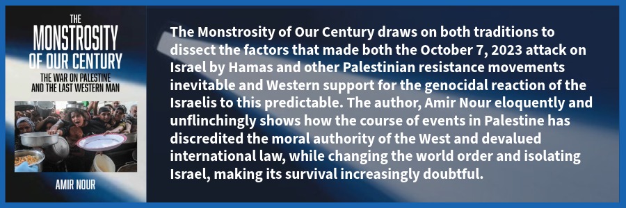 The Monstrosity of Our Century: The War on Palestine and the Last Western Man by Amir Nour provides a comprehensive tour from Israel’s massive offensive against Gaza, the West Bank, Lebanon, Syria, Yemen, and Iran, to a projection of the grand transformation of the world that this is bringing into being after more than three centuries of complete Western domination.